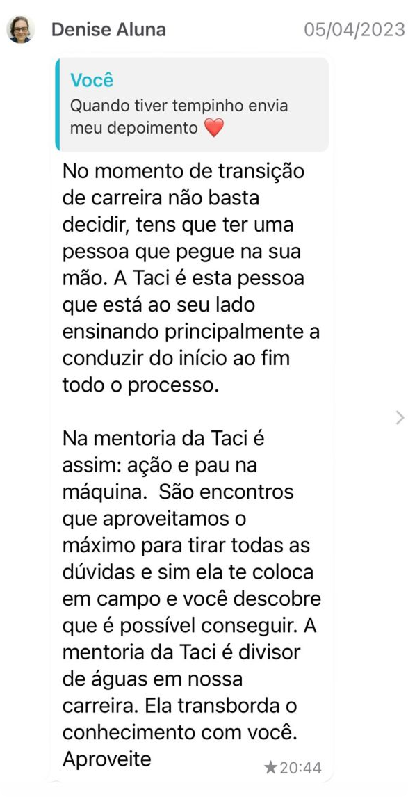 Ao longo da sua trajetória, ajudou dezenas de mulheres a iniciarem na área da saúde com profissionalismo, leveza e estrutura, transformando a rotina de médicos e nutricionistas e gerando independência financeira para quem deseja trabalhar na área.
